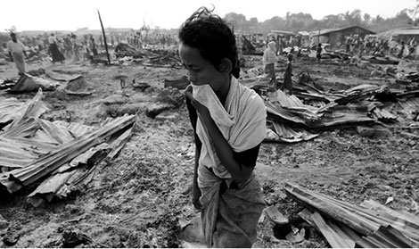 Một phụ nữ Rohingya lang thang trong ngôi làng bị thiêu rụi. |