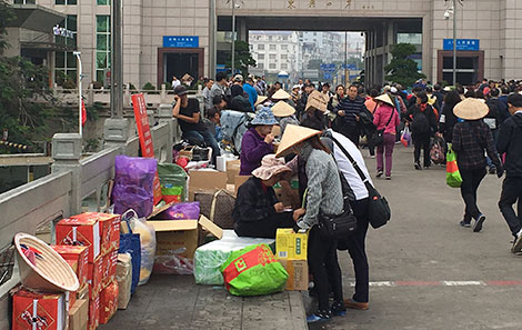 | Cư dân biên giới mang hàng từ Trung Quốc về qua Cửa khẩu Quốc tế Móng Cái. |