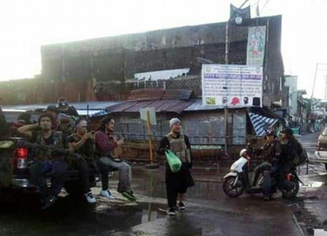 | Phiến quân Maute và cờ đen của IS xuất hiện tại thành phố Marawi. |