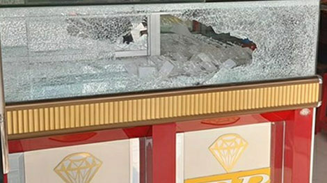 Tủ kính trưng bày vàng của tiệm T.P. sơ sài, dễ bị đập vỡ.