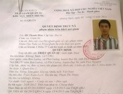 Hiện các cán bộ trại giam Quân khu 5 đang ráo riết truy bắt 2 phạm nhân trốn trại Triệu Quân Sự và Nhâm Văn Tuấn.