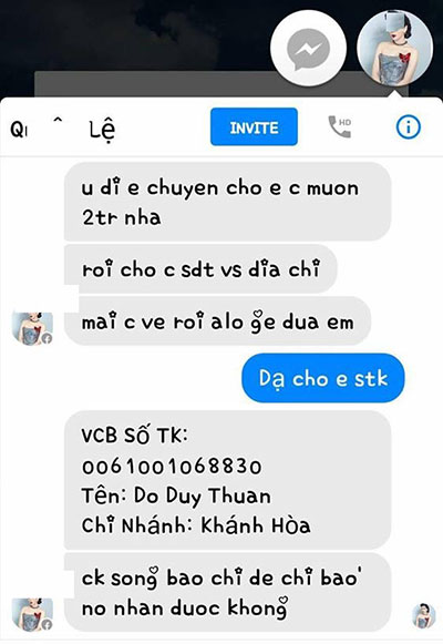 Trong khoảng một giờ đồng hồ, tài khoản “Ngọc Vũ” tiếp tục nhắn cho Thanh bàn thêm về những câu chuyện buổi sáng còn dang dở. Thấy bạn quan tâm đến việc làm ăn, Thanh cũng trả lời rất nhiệt tình. Rồi bất ngờ tài khoản “Ngọc Vũ” hỏi mượn Thanh tiền vì “vừa nhập một đơn hàng lớn, thiếu hơn trăm triệu”. Là chủ doanh nghiệp, Thanh luôn rất cảnh giác trước những việc liên quan đến tiền bạc. Song vì quá tin tưởng bạn bè, Thanh lập tức chuyển tiền vào số tài khoản mà “Ngọc Vũ” nhắn cho.