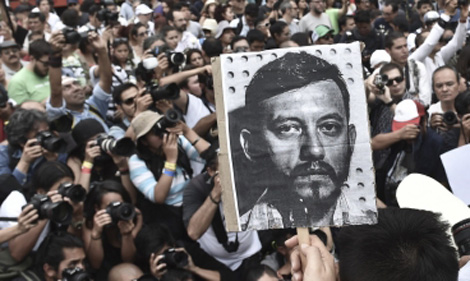 | Các nhà báo giương cao bức ảnh chụp đồng nghiệp Ruben Espinosa trong cuộc biểu tình tổ chức tại quảng trường Angel of Independence ở Mexico City, ngày 2-8-2015. |