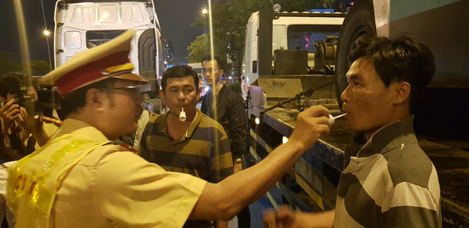Các tổ công tác Công an Thành phố Hồ Chí Minh thực hiện kiểm tra nhanh nồng độ cồn và ma túy đối với tài xế xe tải đường dài. Ảnh: Minh Đức.