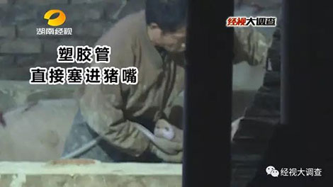 Tại tỉnh Hồ Nam, Trung Quốc, đầu năm 2017 một phóng viên đã bí mật thâm nhập vào một cơ sở bán lợn sau khi người dân phản ánh rằng, họ nghe thấy tiếng kêu sợ hãi bất thường của những con lợn nơi đây. Ngay sau khi mục sở thị, cánh phóng viên đã bị sốc khi nhìn thấy một người đàn ông lực lưỡng ép các con lợn ở đây ăn một thứ giống như bùn. Toàn bộ quá trình này đã được phóng viên bí mật quay lại.