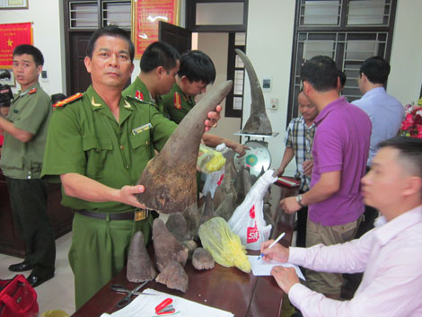 Bộ trưởng Bộ Công an gửi thư khen Ngay sau khi chuyên án buôn bán vận chuyển sừng tê giác cực lớn được khám phá, bắt quả tang 2 đối tượng cùng tang vật, ngày 14/5/2015, Đại tướng Trần Đại Quang, Ủy viên Bộ Chính trị, Bộ trưởng Bộ Công an đã có Thư khen. Bộ trưởng Trần Đại Quang đánh giá, đây là chiến công xuất sắc của cán bộ, chiến sĩ Công an tỉnh Nghệ An, các Cục kỹ thuật nghiệp vụ trong đấu tranh trấn áp tội phạm. Thay mặt Đảng ủy Công an Trung ương và lãnh đạo Bộ Công an, Bộ trưởng Trần Đại Quang nhiệt liệt biểu dương thành tích của các đơn vị tham gia phá án và quyết định thưởng cho 4 đơn vị: Phòng Cảnh sát Điều tra tội phạm về Trật tự quản lý kinh tế và Chức vụ; Phòng Kỹ thuật nghiệp vụ II Công an tỉnh Nghệ An; Phòng 4, Cục Kỹ thuật nghiệp vụ I; Phòng 3, Cục Kỹ thuật nghiệp vụ II, mỗi đơn vị 10 triệu đồng, trích từ Quỹ Phòng, chống tội phạm Trung ương. Bộ trưởng yêu cầu Công an tỉnh Nghệ An khẩn trương khai thác các đối tượng, mở rộng điều tra và sớm đưa vụ án ra xử lý trước pháp luật nhằm răn đe, phòng ngừa chung; đồng thời tăng cường nắm tình hình, phát hiện, điều tra các vụ án khác. |
