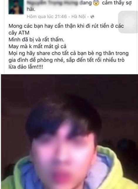 Vụ việc một nhóm học sinh tuổi vị thành niên sử dụng tài khoản Facebook mạo danh thành viên tổ chức khủng bố Nhà nước Hồi giáo tự xưng (IS) để đe dọa, kích động khủng bố bị cơ quan chức năng làm rõ, xử lý vào cuối tháng 11 vừa qua chưa kịp lắng xuống, thì những ngày đầu tháng 12 này, trên mạng xã hội Facebook lại xôn xao trước clip chia sẻ bị thôi miên tại cây ATM trên phố Ngọc Hà (quận Ba Đình, Hà Nội) của tài khoản có tên Nguyễn Trọng H., một thanh niên đẹp trai, đang theo học một trường nghệ thuật tại Hà Nội.