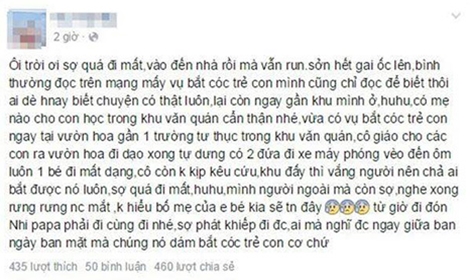 Chị M. viết: "Ôi trời ơi sợ quá đi mất, vào đến nhà rồi mà vẫn run sởn hết gai ốc lên. Bình thường đọc trên mạng mấy vụ bắt cóc trẻ con mình cũng chỉ đọc để biết thôi. Ai dè hôm nay biết chuyện có thật luôn, lại còn  ngay gần khu mình ở. Hu hu. Có mẹ nào cho con học trong khu Văn Quán cẩn thận nhé. Vừa có vụ bắt cóc trẻ con ngay tại vườn hoa gần 1 trường tư thục trong khu Văn Quán. Cô giáo cho các con ra vườn hoa dạo xong tự dưng có 2 đứa đi xe máy phóng vèo đến ôm luôn 1 bé đi mất dạng, cô còn không kịp kêu cứu. Khu đấy thì vắng người nên chả ai bắt được nó luôn. Sợ quá đi mất…".