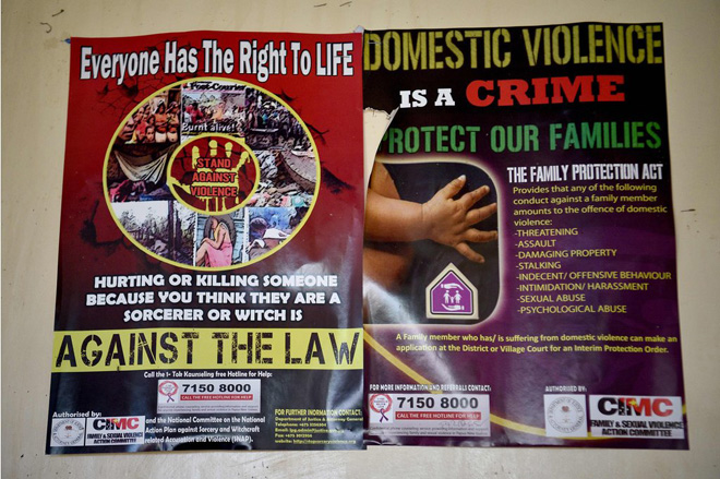 | Poster cảnh báo về ma thuật và bạo lực gia đình tại đồn cảnh sát ở thị trấn Wabag thuộc tỉnh cao nguyên Enga, Papua New Guinea, vào ngày 20-11-2018. |