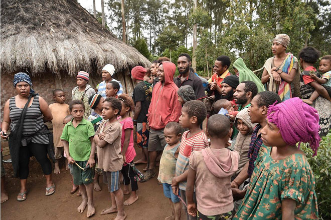 | Hàng xóm tụ tập gần nhà của bà mẹ hai con Rachel 55 tuổi ở Tsak Vally thuộc vùng Tây Nguyên của Papua New Guinea. Tháng 11-2018, bà bị buộc tội phù thủy và bị tra tấn bởi những người mà bà quen biết. |