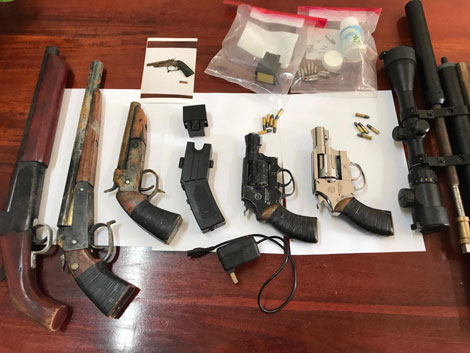 Trong đó, tại nhà của Trần Trung Thành thu giữ 1 dao xếp bằng kim loại dài 22cm, cán kim ốp gỗ; 1 khẩu súng tự chế cùng một vỏ đạn hoa cải đã bắn còn trong nòng súng; 1 súng điện bắn điện màu đen... Tại bãi giữ xe của nhà Tô Nhựt Khanh, thu giữ 1 khẩu súng dạng rulo dài 25cm; 1 khẩu súng bắn đạn hoa cải dài 52cm; 28 viên đạn các loại, 4 vỏ đạn các loại; 1 còng số 8; 1 đầu súng bắn điện màu đen... Tại chỗ ở của Lê Thanh Phúc, thu giữ 1 khẩu súng dạng rulo cùng 6 viên đạn; 1 khẩu súng bắn đạn hoa cải...