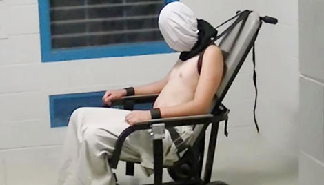 | Một cảnh quay cho thấy, cậu bé 14 tuổi bị trùm kín đầu và trói vào một cái ghế. |