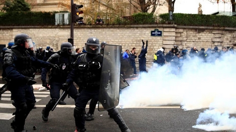 | Cảnh sát Pháp trong cuộc đụng độ với người biểu tình ở thủ đô Paris. |