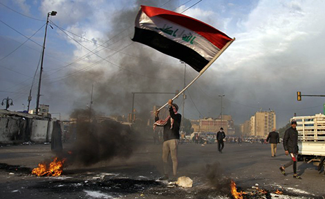 | Một người biểu tình vẫy cờ Iraq để phản đối hành động của cả Mỹ và Iran trong những tuần qua. |