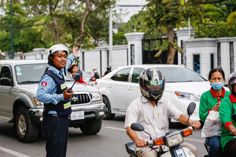 | Cảnh sát giao thông làm nhiệm vụ ở Phnompenh. |