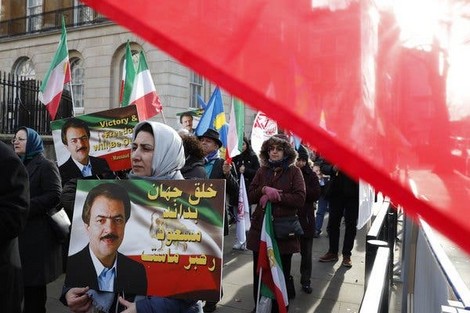 | Một cuộc biểu tình của những người ủng hộ OMPI mang theo những bức ảnh Massoud Radvijavi, thủ lĩnh của nhóm, người được xem là mất tích từ năm 2003. |