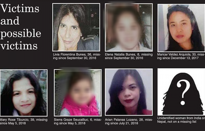 Danh tính nghi phạm không được nêu tên vì anh ta chưa bị buộc tội chính thức. Trước đó, khách du lịch vô tình trú mưa phát hiện một thi thể trong tư thế bị trói trong hầm mỏ. Đó là nạn nhân đầu tiên, được nhận dạng là Marry Rose Tiburcio, 38 tuổi, người đã mất tích cùng cô con gái 6 tuổi Sierra vào tháng 5-2018. Trong quá trình tìm kiếm thi thể các nạn nhân tiếp theo, nhà chức trách đã sử dụng sóng siêu âm để quét quanh khu vực hồ nước nhân tạo nằm giữa mỏ đồng bị bỏ hoang.