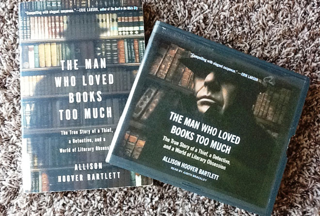 | Ấn bản giấy và audio cuốn sách The man who loved books too much. (Ảnh đăng tại Thebookshelfofemily.com). |
