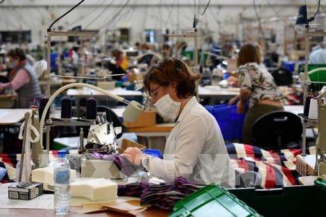 | Công nhân may khẩu trang để cung ứng cho người dân tại một nhà máy ở Saint-James, Pháp ngày 22-4-2020. |