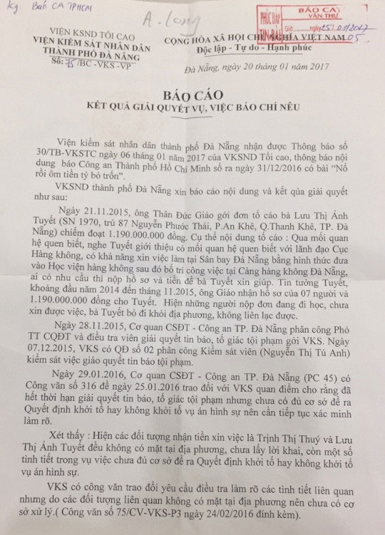 Hiện những người nộp đơn đang đi học, chưa xin được việc. Và hiện đối tượng Lưu Thị Ánh Tuyết đã bỏ trốn khỏi nơi cư trú. Nhận thấy vụ việc lừa đảo xin việc, chiếm đoạt tài sản với số tiền tổng cộng khá lớn (trên 1 tỷ đồng), nên Công an quận đã hướng dẫn cho các đương sự gửi đơn trình báo lên Công an TP. Đà Nẵng để giải quyết theo đúng thẩm quyền.