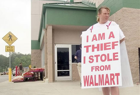 | Một kẻ trộm cắp bị phạt mang biển hiệu "Tôi là kẻ trộm". |