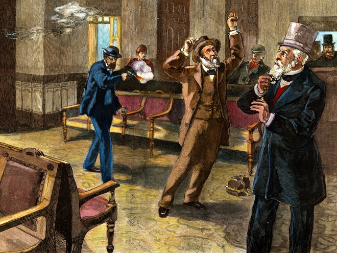 Tổng thống Garfield đang đi đến ga xe lửa số 6 của tuyến đường sắt Baltimore - Potomac ở Washington, D.C vào lúc 9 giờ 30 phút sáng. Khi Tổng thống Garfield bước vào phòng chờ của nhà ga, luật sư tâm thần Charles J. Guiteau bước về phía trước và bóp cò súng từ phía sau. Garfield kêu lên "Chúa ơi, cái gì vậy?" và giơ tay lên.