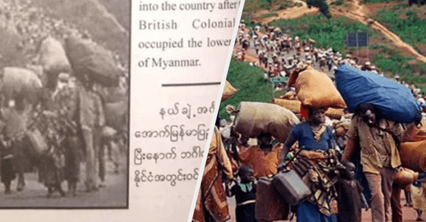 Một hình ảnh khác cho thấy một đám đông những người đàn ông khuân vác đồ đạc trên vai đi thành hàng dài, với chú thích: “Người Bengal xâm nhập vào đất nước sau khi chủ nghĩa thực dân Anh chiếm phần dưới của Myanmar".