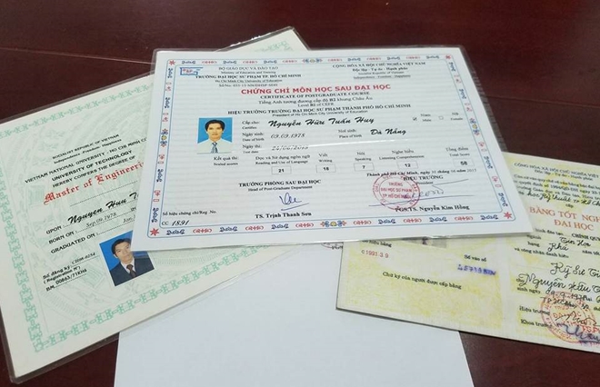 Đặc biệt, qua công tác thanh kiểm tra, Ban giám hiệu Trường Đại học Đông Á đã phát hiện những văn bằng thạc sĩ, chứng chỉ nghiệp vụ chuyên môn của Huy (do Trường ĐH Sư phạm TP. Hồ Chí Minh và ĐH Bách khoa TP. Hồ Chí Minh cấp) có dấu hiệu giả mạo…
