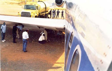Nhân viên kỹ thuật tiếp nhiên liệu cho chiếc Boeing 727-223 tại một sân bay ở khu mỏ khai thác kim cương, miền bắc Angola. |