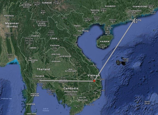 | Đường bay của CX700Z từ Bangkok đến Hong Kong. |