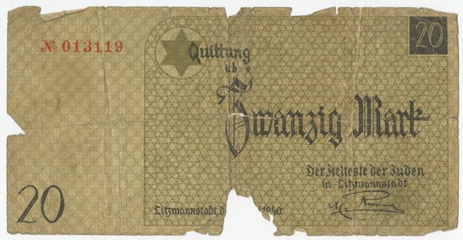 | Một tờ tiền giấy từng được Đức quốc xã in ấn và cho sử dụng trong "khu ổ chuột" Lodz ở Ba Lan. |