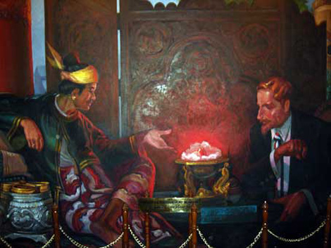 | Hình vẽ cảnh Vua Thibaw cho Đại tá Sladen xem bảo vật hồng ngọc Nga Mauk. |