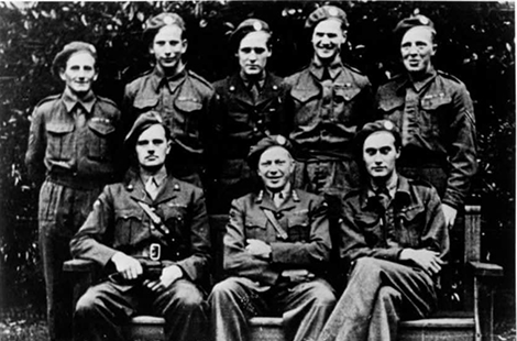 | 8 biệt kích SOE thực hiện việc phá hủy máy điện phân nước nặng (ngồi giữa là thiếu tá Jens-Anton Poulsson). |