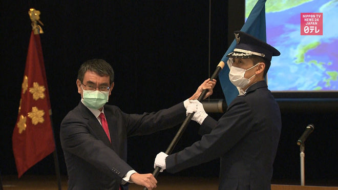 | Bộ trưởng Quốc phòng Nhật Bản Kono Taro trao cờ thành lập cho Lực lượng tác chiến vũ trụ. |