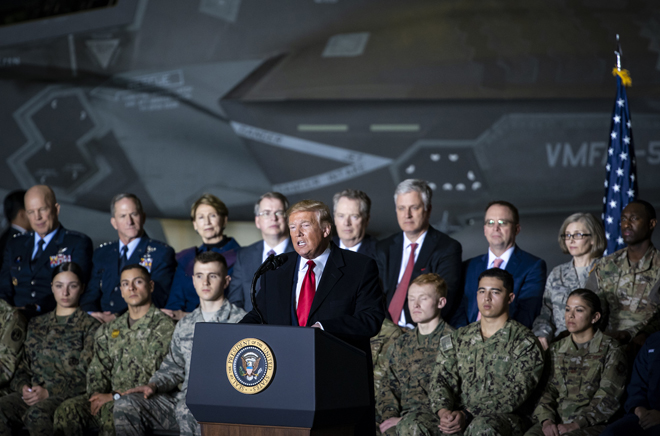 | Tổng thống Mỹ Donald Trump phát biểu tại căn cứ quân sự ở Maryland sau khi ký quyết định thành lập Lực lượng vũ trụ. Ảnh: Bloomberg. |