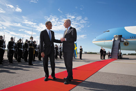| Cựu Tổng thống Mỹ Barack Obama và Thủ tướng Thụy Điển Carl Bildt tại sân bay Arlanda ở Stockholm năm 2013. |