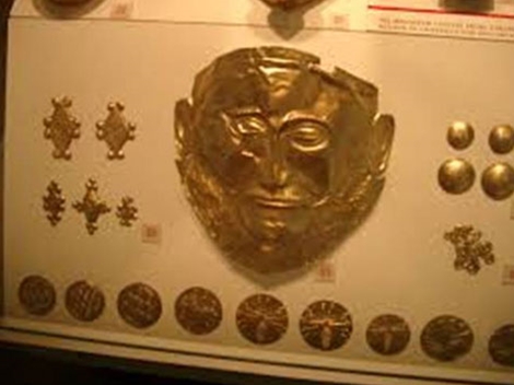 | Mặt nạ của Agamemnon thuộc bộ sưu tập Troy, trưng bày tại Bảo tàng Khảo cổ học Quốc gia Hy Lạp. |