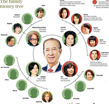 Những người thừa kế của gia tộc này đấu đá lẫn nhau nhằm chiếm quyền kiểm soát cả đế chế cờ bạc tại Macau, không khác gì những bộ phim truyền hình dài tập. Trong số 17 người con của Stanley Ho, người lớn nhất đã 70 tuổi và người nhỏ nhất mới 18 tuổi. một người con của vị tỷ phú này không may qua đời vào năm 2004.