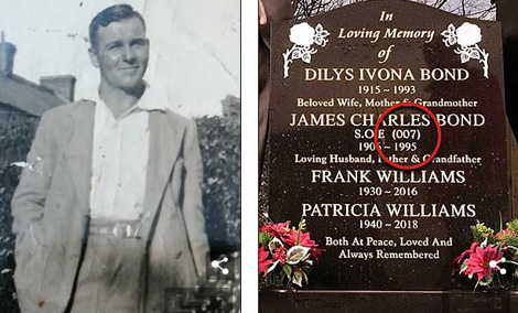 | James Bond (trái) và tấm bia mộ đã được người cháu trai Phillips khắc thêm dòng chữ S.O.E (007) tiết lộ thân phận điệp viên của ông. |