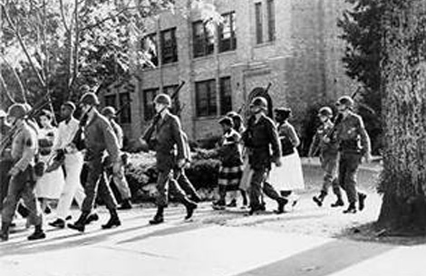 | Vệ binh Quốc gia tháp tùng sinh viên da màu khỏi sự tấn công của người da trắng vào năm 1957. |