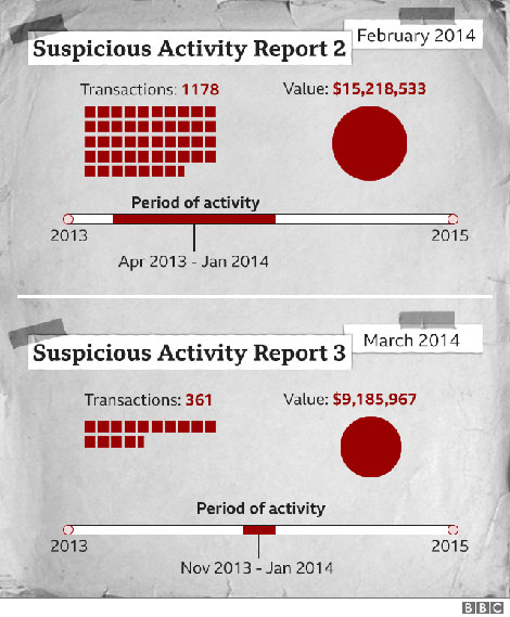 HSBC đã đệ trình SARs đầu tiên về vụ lừa đảo vào ngày 29-10-2013 liên quan đến hơn 6 triệu USD được gửi đến tài khoản của những kẻ lừa đảo ở Hong Kong. Các quan chức ngân hàng cho hay, "không có mục đích kinh tế, kinh doanh hoặc mục đích hợp pháp rõ ràng" đối với các giao dịch và ghi nhận những cáo buộc về "các hoạt động của kế hoạch Ponzi".