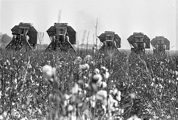 | Máy liên hợp thu hoạch bông ở Uzbekistan, năm 1973. |