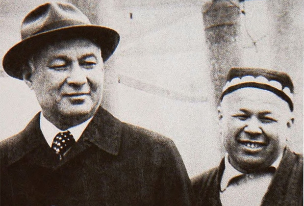 | Sharaf Rashidov (trái) và Akhmazon Adylov, hai kẻ thao túng ngành bông Uzbekistan. |
