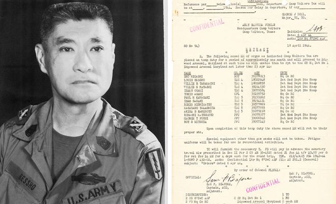 | Bức chân dung cựu binh Louis Bessho chụp năm 1969 (trái). Mệnh lệnh của quân đội Mỹ từ tháng 4 -1944 áp dụng cho binh sĩ Mỹ gốc Nhật bao gồm cả cựu binh, người tham gia vào thử nghiệm khí mù tạc ở Kho vũ khí Edgewood (phải). Ảnh nguồn: Army Service Forces, Headquarters Camp Wolters Texas. |