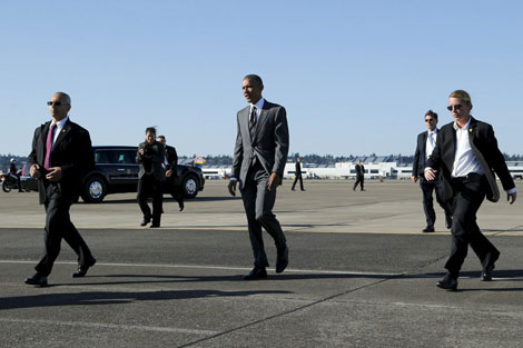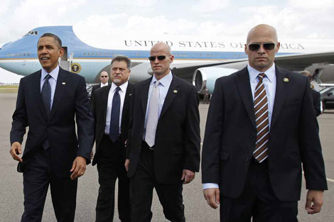 Nhân viên USSS (mang kính đen) bảo vệ Tổng thống Obama trong chuyến công du đến Colombia, năm 2012. |