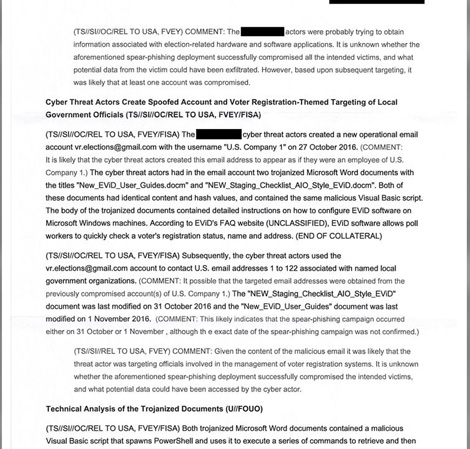 Theo The Guardian, nội dung tư liệu bị rò rỉ là bản báo cáo tình báo đề ngày 5-5-2016, về cuộc điều tra vụ tin tặc Nga tấn công hệ thống máy tính bầu cử Mỹ. Mặc dù không có phiếu bầu nào bị ảnh hưởng, nhưng vụ tấn công đã đặt ra nhiều câu hỏi nghi vấn về khả năng tình báo Nga có liên quan tới các tin tặc và bí mật can thiệp nhằm tạo ra kết quả bầu cử theo hướng có lợi cho ông Trump?