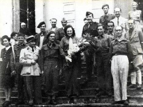 | Nancy Wake (đứng giữa) được tặng hoa và tung hô như người hùng vào năm 1945. |
