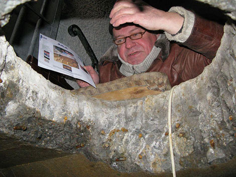 Nhà sử học S. Trifonov trước lối vào hệ thống cống ngầm. |