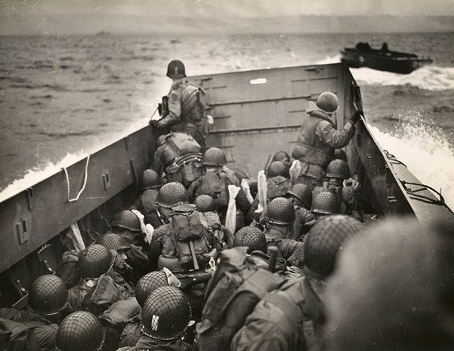 | Binh sĩ lèn chật cứng bên trong chiếc tàu đổ bộ LCVP khi con tàu phi qua cơn sóng dữ. Không xa đó là bờ biển Normandy. Ảnh nguồn: Bảo tàng ĐCTGII Quốc gia. |