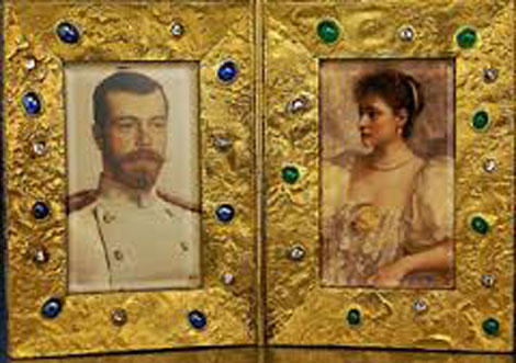 | Một trong những khung ảnh của vợ chồng Sa hoàng bằng vàng ròng, được khảm nhiều kim cương, ngọc quý. |